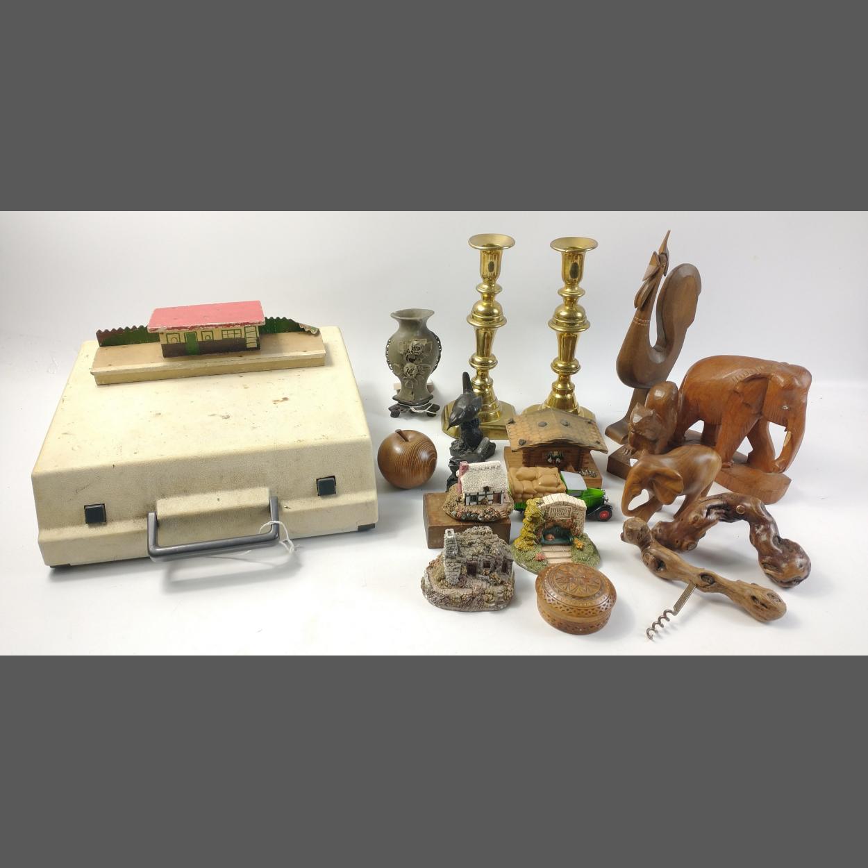 A mixed lot to include a portable typewriter, various wooden figures to include elephants, an apple, a squirrel etc
