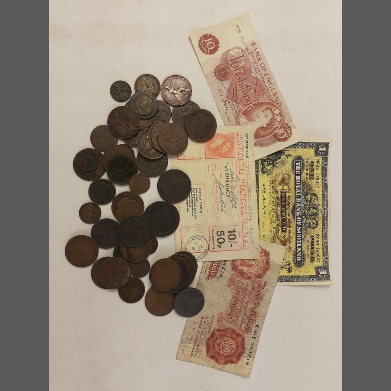 A small bag of obsolete coinage to include a rather nice Royal Bank Of Scotland One Pound from 1963, an O'Brien ten shilling with wear, a 1797 Cartwheel penny with wear, a better 1806 Halfpenny, a George II penny with heavy wear and other low denomination coins