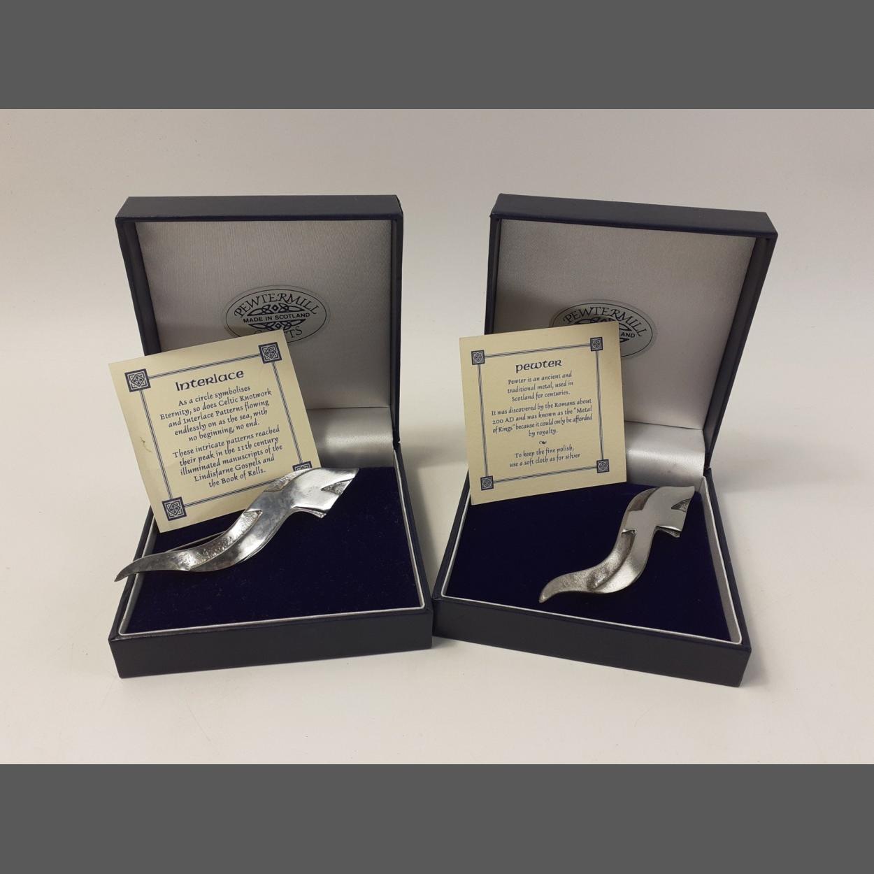 SCOTTISH PEWTERMILL CRAFTS Pewter brooches in boxes. Both in the style of Celtic Interlaced waving Saltire flags. Very attractive solid well made and attractive pieces