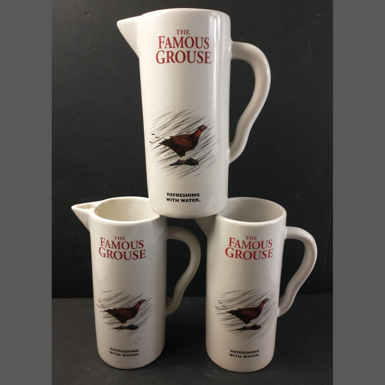 Vintage THE FAMOUS GROUSE ' Refreshing With Water' large whisky water jugs x3 in white in good condition with no cracks, chips or signs of damage repair - dimensions height 20cm x 14cm width approx