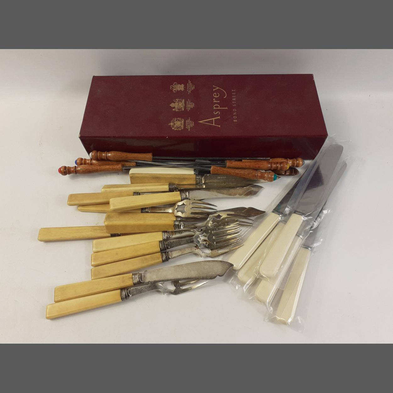 An Asprey of Bond Street box containing a quantity of bone handled Victorian flatware by THOMAS WILKINSON of Birmingham. Box also containing fondue forks.