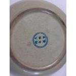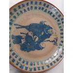 A pair of antique Chinese printed blue glazed ceramic plates. Characters around the rims, with an illustration of immortals in the centre and mark to base. Each plate measures 26cm across approx.