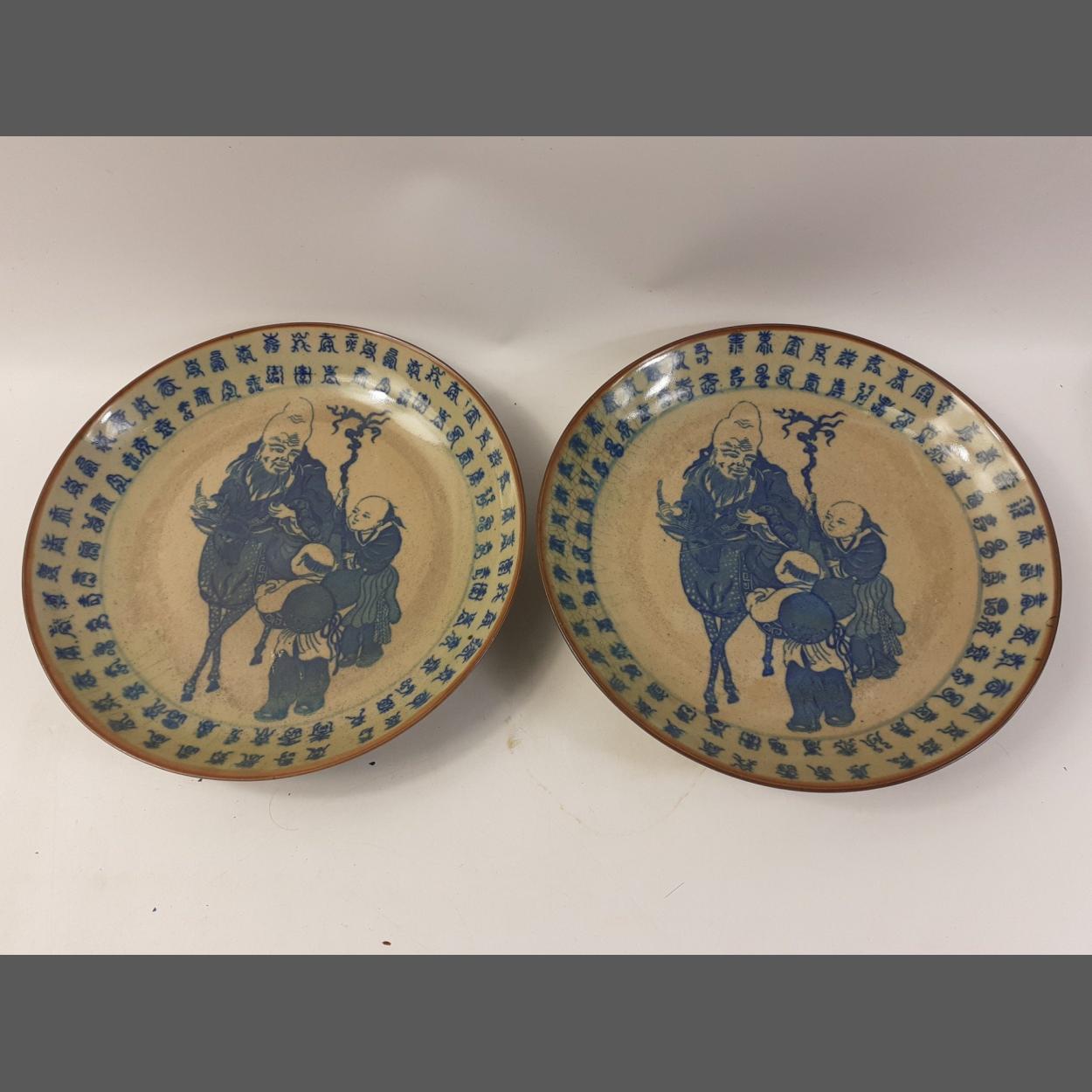 A pair of antique Chinese printed blue glazed ceramic plates. Characters around the rims, with an illustration of immortals in the centre and mark to base. Each plate measures 26cm across approx.
