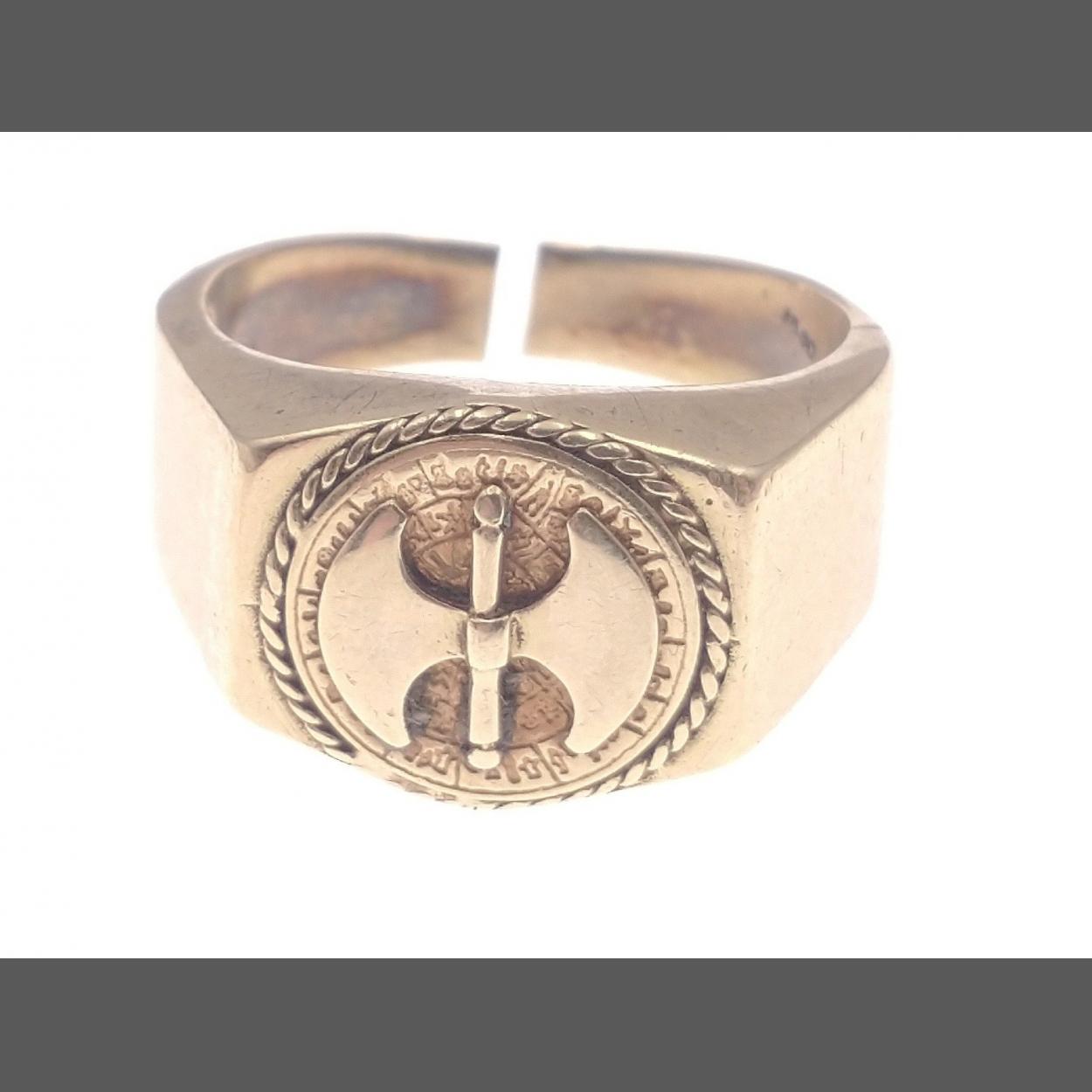 A gent's signet ring with Viking double-headed axe, stamped 585, approx size T (ring has been split), weight 7.75g