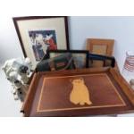 A mixed box to include a boxed MR BENN watch with leather strap, a carved wooden motorbike approx 30cm long, miniature wooden trains, a wooden tray decorated with a cat 50x32cm approx, 3 framed Pierrot pictures etc etc
