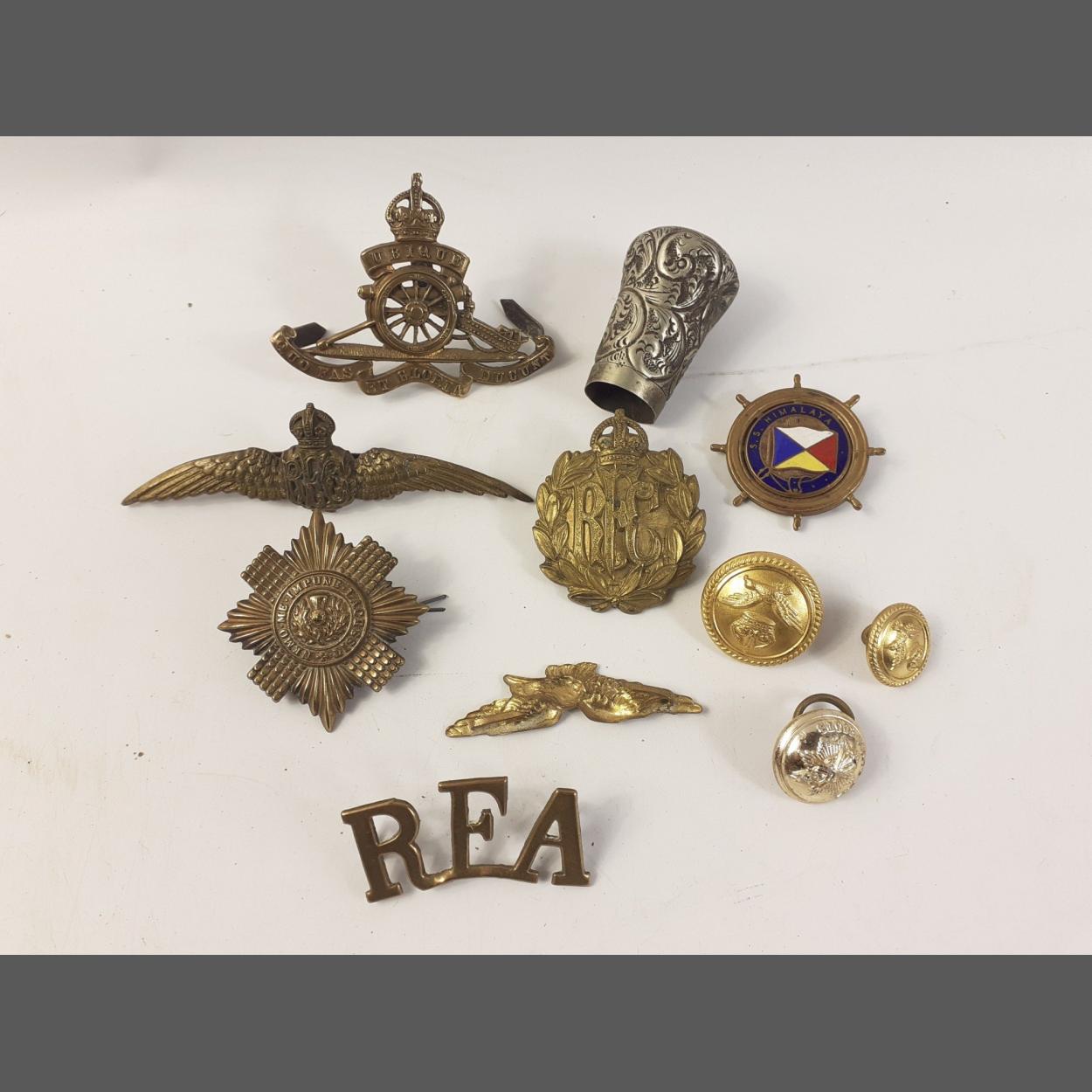 Military CAP BADGE lot to include original RFC Royal Flying Corps pilot wings and a badge, Royal Artillery, an SS Himalaya badge, Scots Guards badge, a silver cane topper and buttons. An interesting little collection.