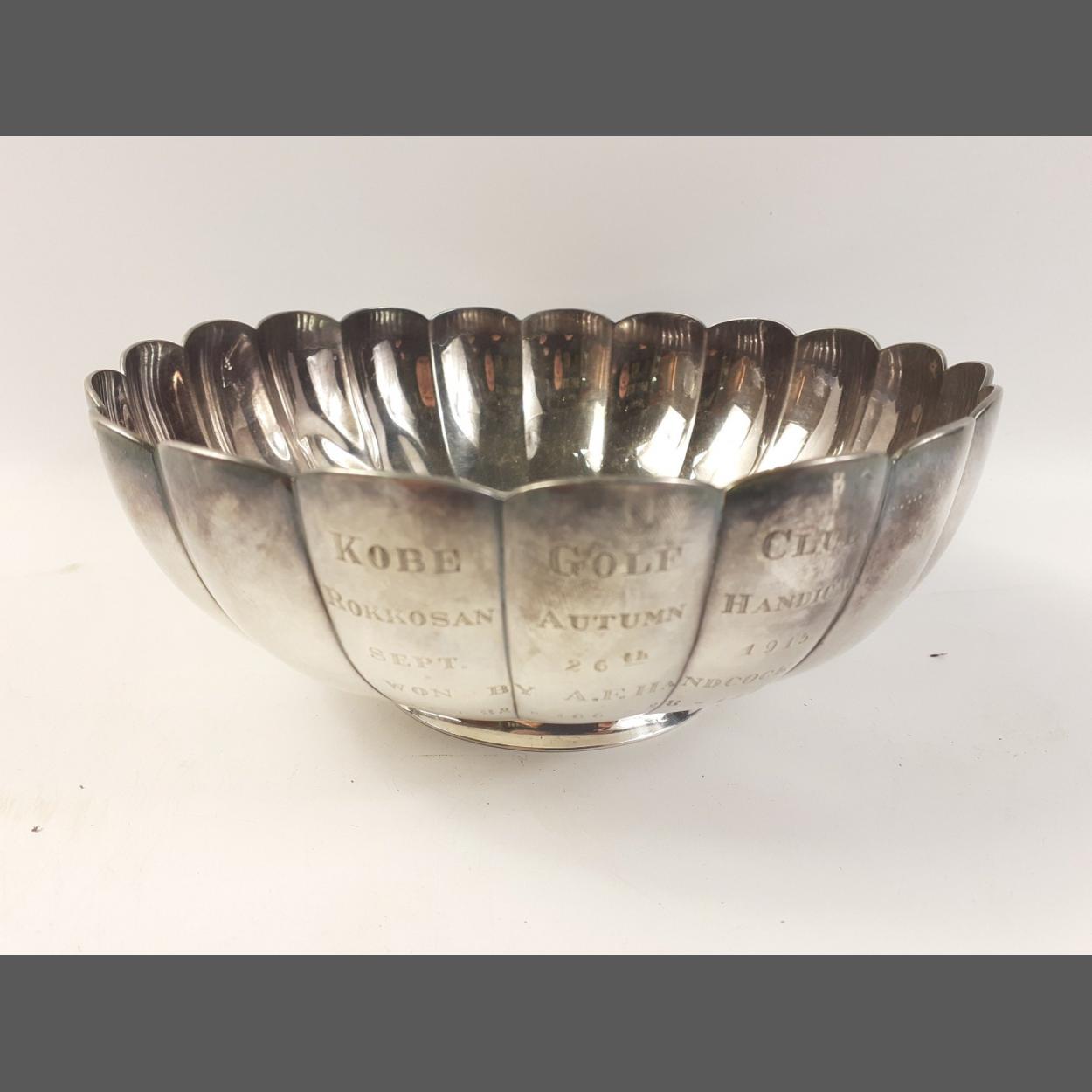 A white metal trophy with scalloped edges (17cm diameter), presented by the Kobe Golf Club, Japan to AF Handcock in 1915, weight 358g