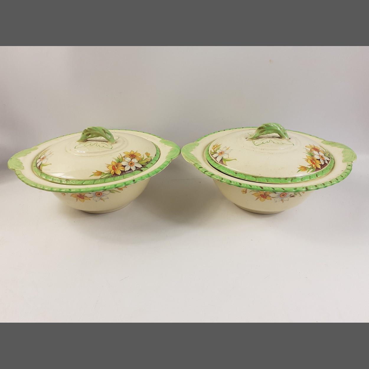 A pair of attractive NEW HALL HANLEY Staffordshire lidded vegetable dishes in good order. Each approx. 23cm across and both in good order with no chips or cracks.