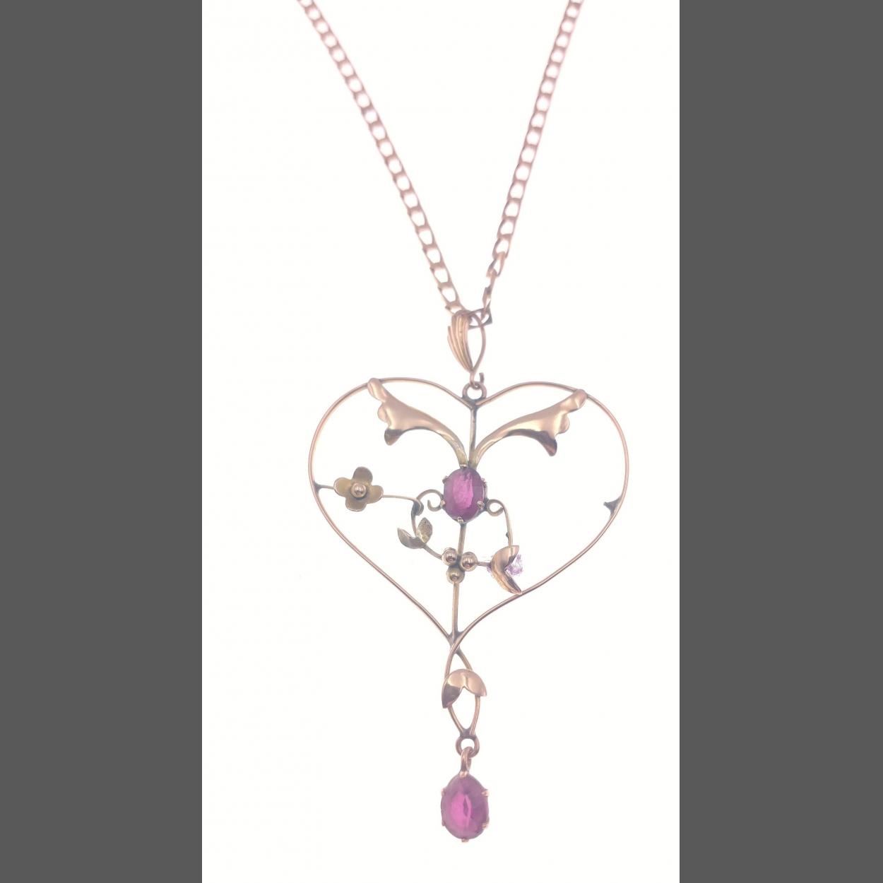 A beautiful unmarked yellow metal heart-shaped pendant with small amethyst-style stones with a 375 stamped gold necklace 2.63g approx- gross weight for both 4.29g approx