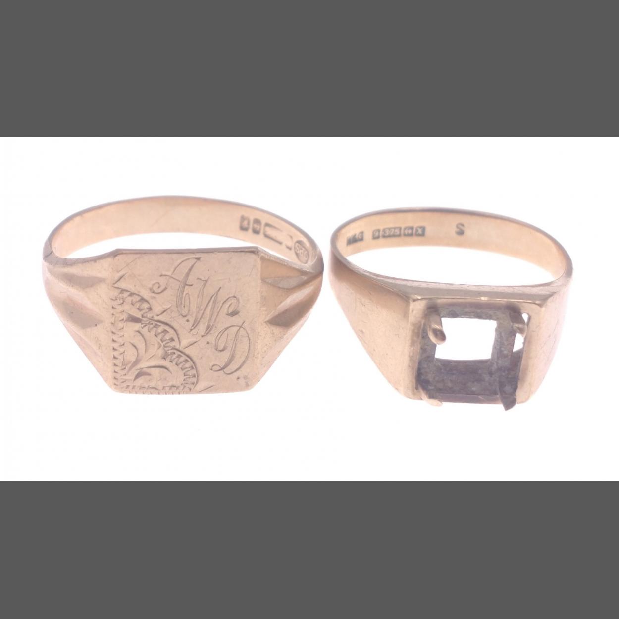 A 375 hallmarked Birmingham yellow gold signet ring with initials engraved AWD weight 3.16g approx and also a Birmingham hallmarked ring with missing stone weight 3.34g approx