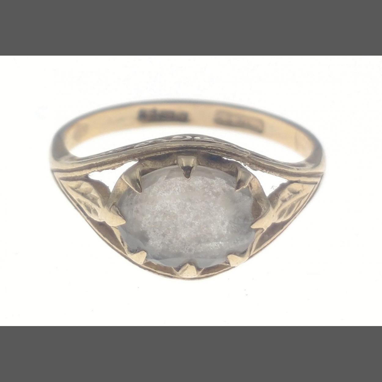 An antique 375 stamped yellow gold dress ring size M with a large quartz white-ish centred stone gross weight 2.25g approx
