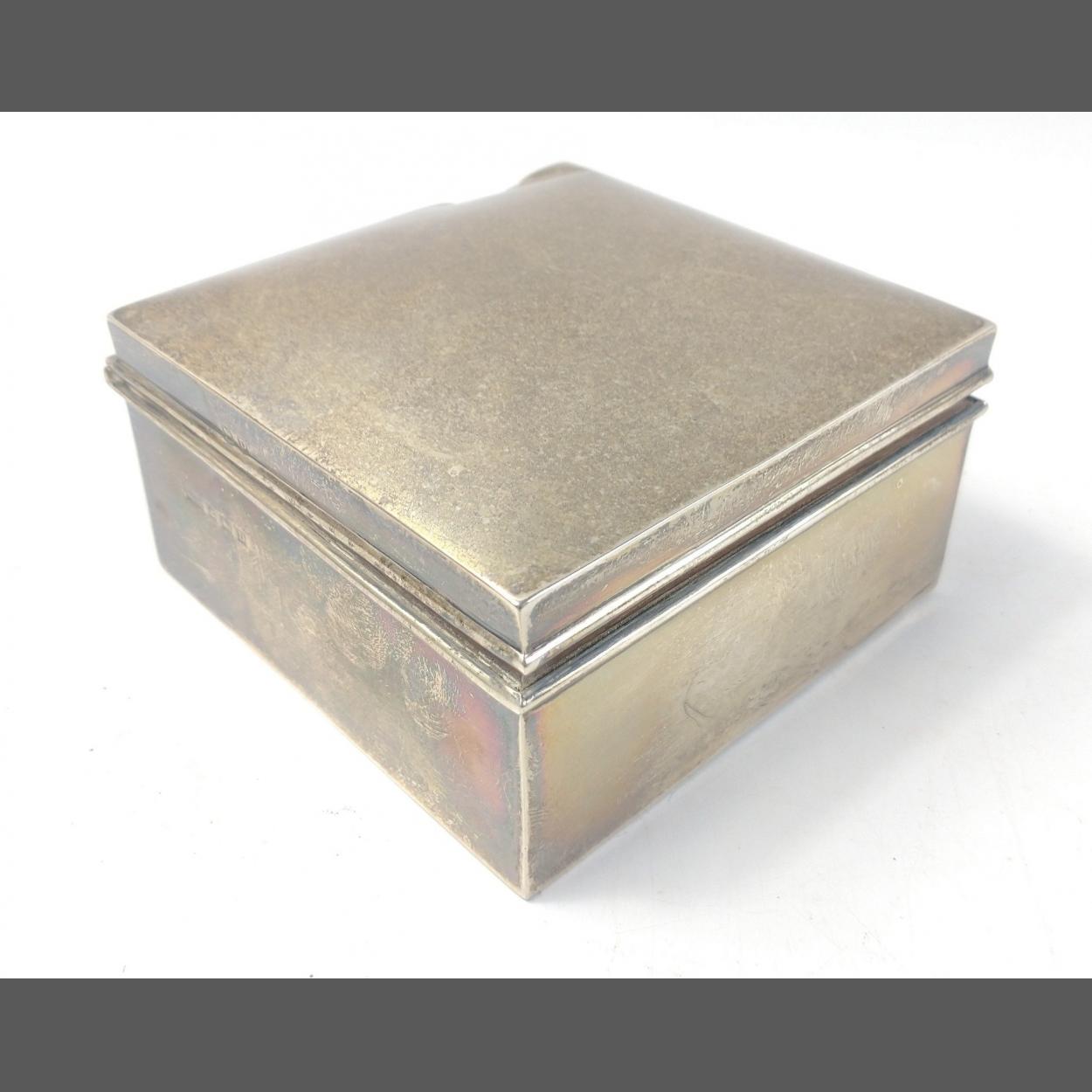 A wooden lined silver hallmarked Birmingham 1928, cigarette box measuring 9x9x5cm, gross weight 380g approx, small dent on one edge