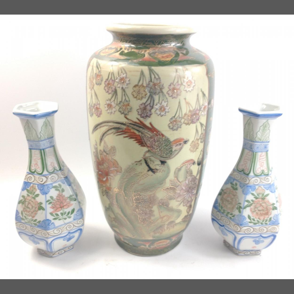 A large SATSUMA vase with bird of paradise decor standing 37cm tall and a pair of 6-sided vases with floral pattern made in Thailand