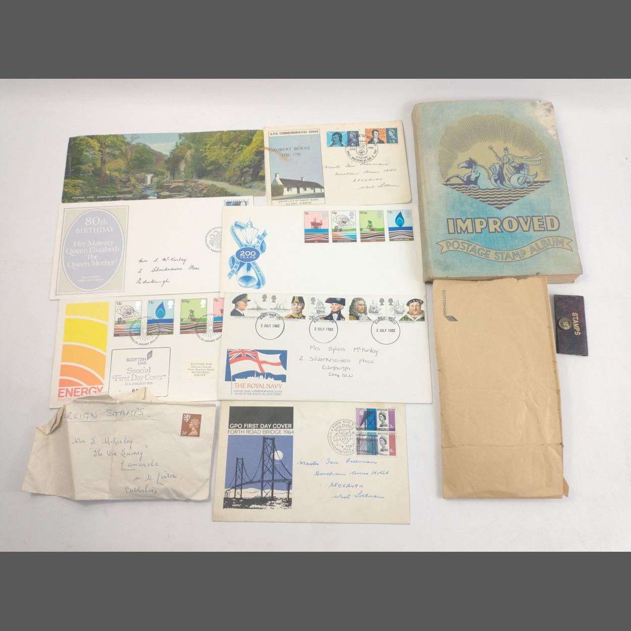 A collection of British and world stamp collection book to include also GPO 1st Day Covers Fourth Road Bridge 1964, Energy commemorative stamps Electricity, Coal Natural gas and Oil, also Robert Burns Commemorative cover, loose stock British stamps and The Commonwealth stamp etc