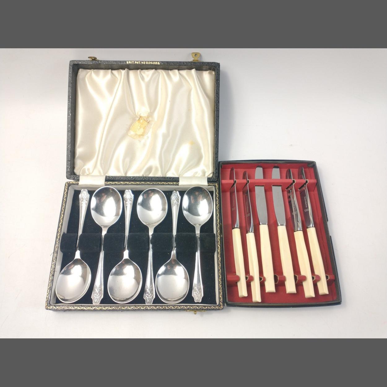 A boxed set of six VINER'S butter knives plus a box of 6 F. COBB & CO EPNS spoons