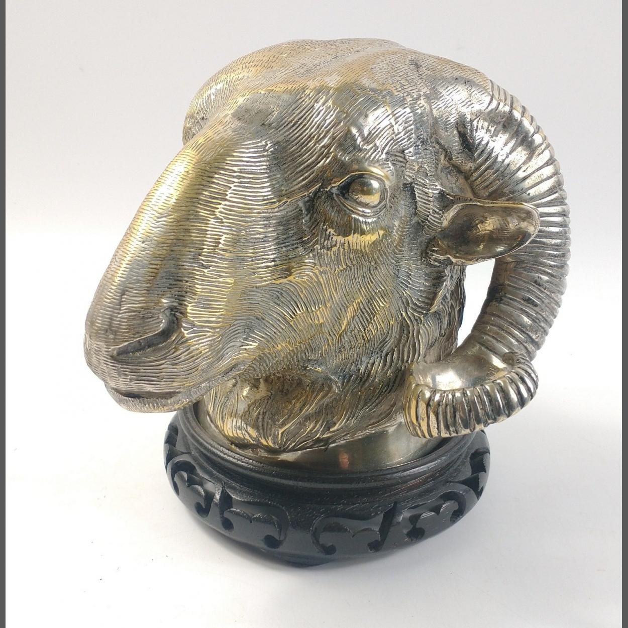 A silvered bronze Ram's Head with a separate wooden stand
