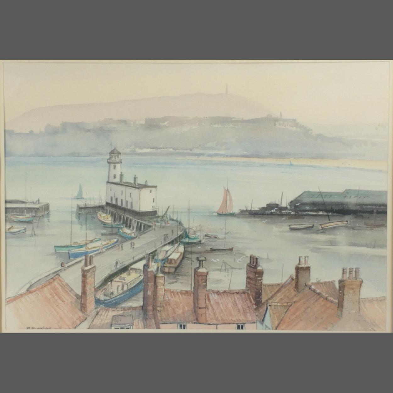 A watercolour scene of Scarborough harbour by B BROADBANK, frame measures 60x49cm approx, visible work 42x30cm approx