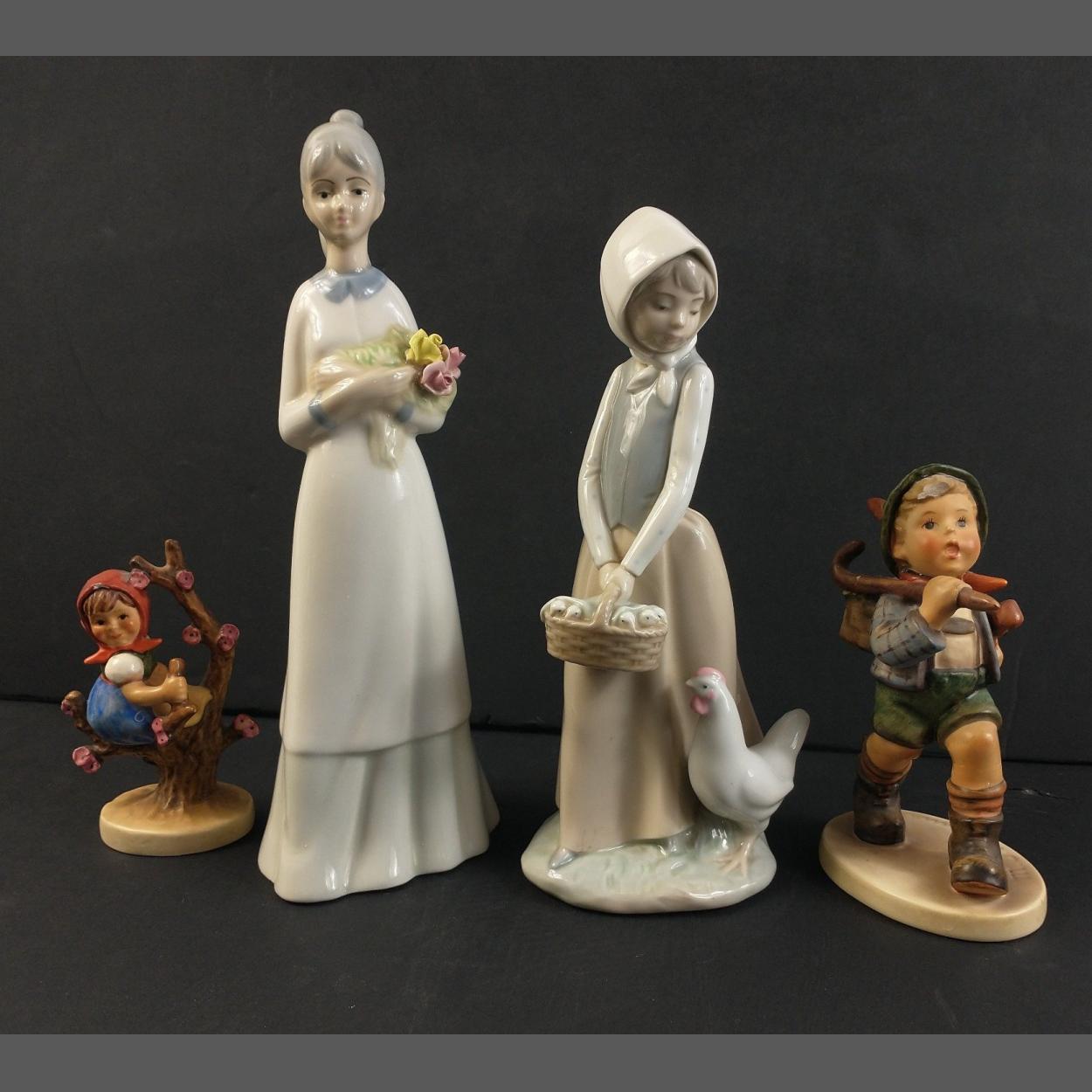 A Nao by Lladro figure of a girl with a basket of chicks and another Spanish figure of a girl holding a bunch of flowers also two Goebel figures with damage