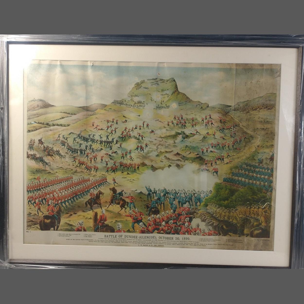 VICTORIAN BATTLE PRINTS published by G.W. Bacon of London. A superb original litho colour print entitled BATTLE OF DUNDEE (GLENCOE) October 20 1899. Recently framed to a high standard. There are some creases and age related wear to the paper itself but it displays beautifully. Total frame size 90x 70cm approx. Comes with paper descriptive history for pasting to the back of the frame.