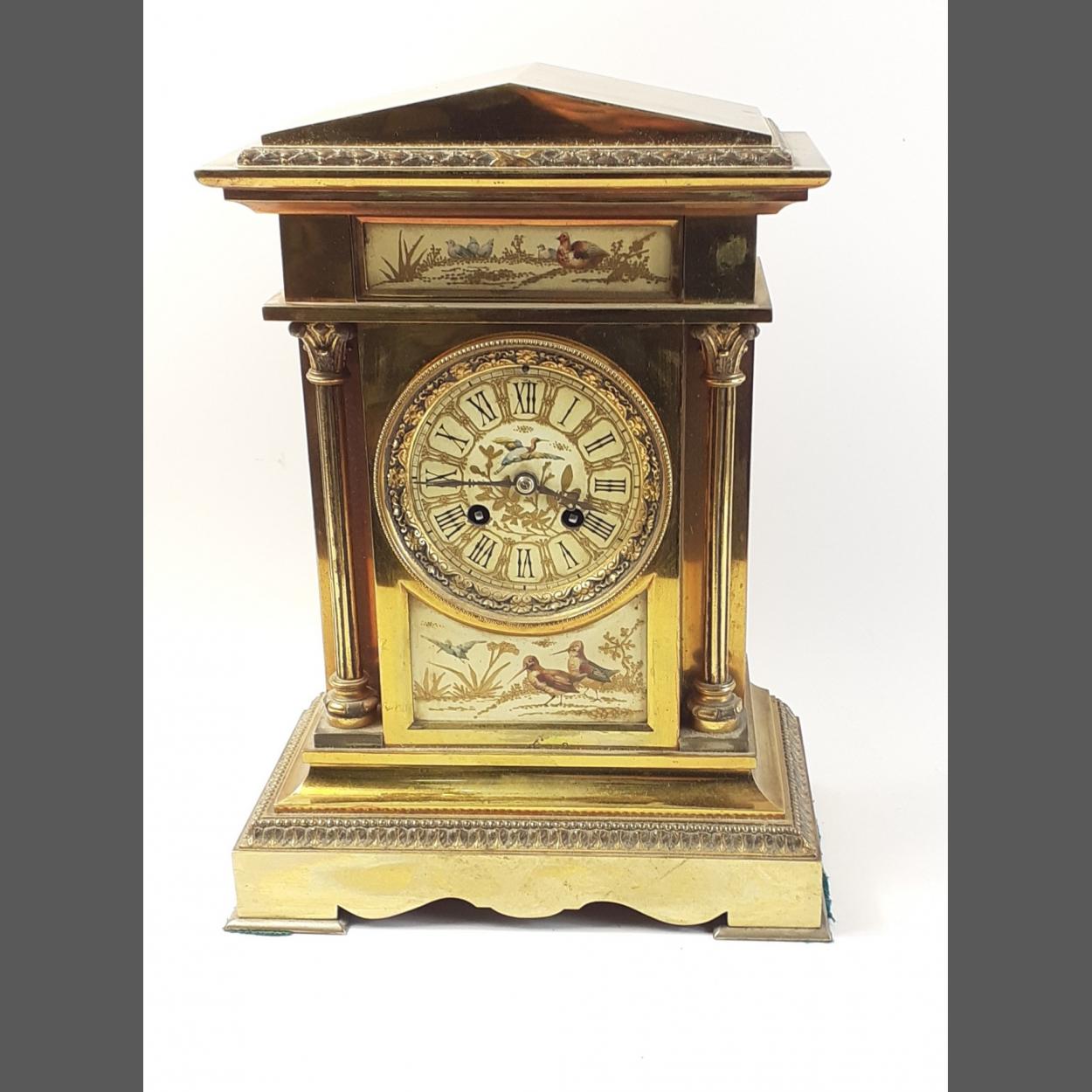 A superb heavy brass cased Palladian style brass mantle clock. A truly gorgeous piece with elaborate decorated panels with scenes of wildfowl. Reputedly French in origin. No makers name discernable but has 11070 stamped on rear. Supplied with keys and pendulum. Fully serviced in 2007 by Hollyrood Watch & Clock repair in Edinburgh at some expense. We are assured that the clock is operational.