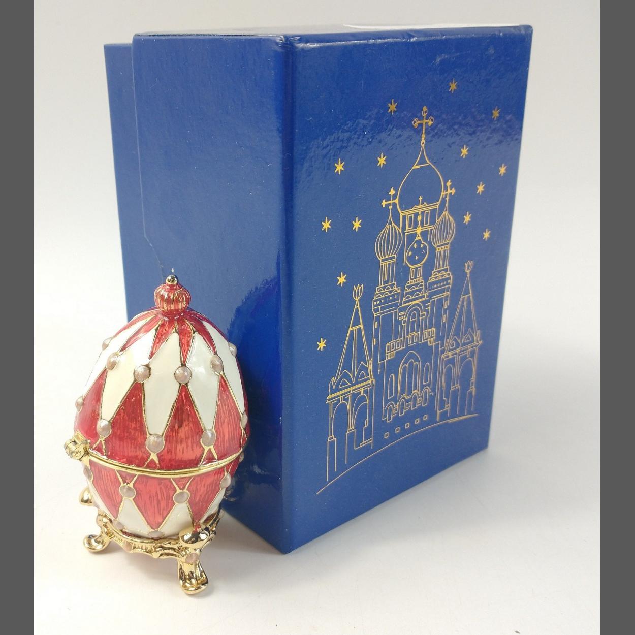 A SUPER QUALITY FABERGE INSPIRED small decorative egg on a stand - the egg is hinged and half opens-up to reveal a highly polished gold painted interior for your special keepsakes! - dimensions when sitting on the stand height 7.5cm - when off the stand 6.5cm x width 4cm approx - comes in its authentic Russian styled Royal Blue box - a perfect gift for your loved one !