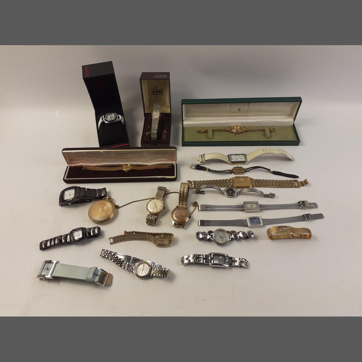 A collection of wrist watches some still in original presentation jeweller's boxes to include a LIMIT watch, A SEKSY bling watch(unworn) with original box, A TIMEX gold coloured strap and watch within a jeweller's box, a 1928 yellow metal wrist watch within a GUCCI jeweller's box, a gents PULSAR watch, a gents and a ladies HIS AND HER SWISS LINE wrist watches in black, an EVERITE yellow metal pocket watch and chain, an ANDORA gents watch with expandable bracelet, a gents ORIS yellow metal wristwatch, a vintage ladies CORTEBERT cocktail watch in unmarked case, a LIMIT unisex watch, a SEKONDA pale blue faced watch and strap, a LIMIT ladies gold coloured faced and bracelet watch, an INFINITE stainless steel wtch with blue dial, a LIMIT slender gold coloured watch with gold coloured matching bracelet, a HENLEY bracelet watch, another stainless steel bracelet LIMIT ladies watch, a CITIZEN ladies watch, JEAN MARC stainless steel watch and bracelet