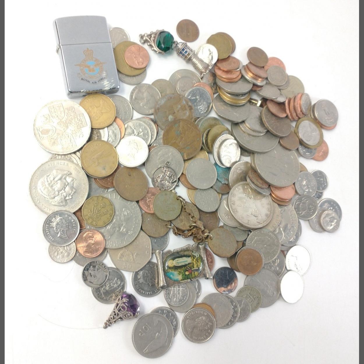 Assorted coins, mainly obsolete UK coinage with some Canadian, Norwegian etc. Lot also includes a Zippo lighter and some small charms.