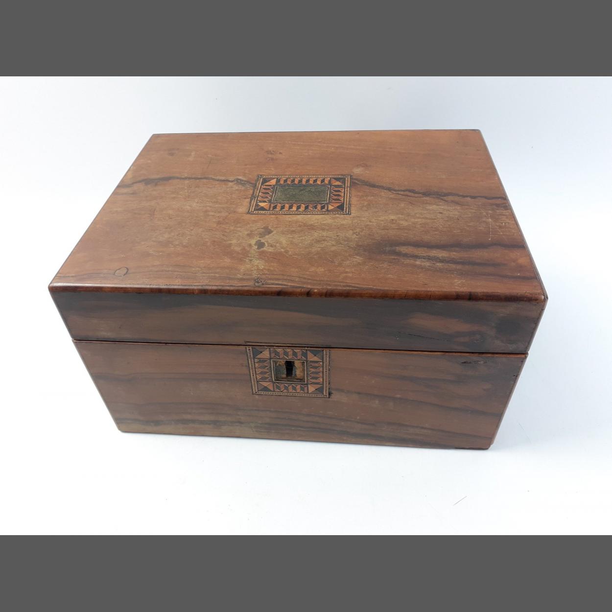 A wooden box with inlay. No key and not currently opening. Otherwise in good order. Measures 28 x 20 x 15cm