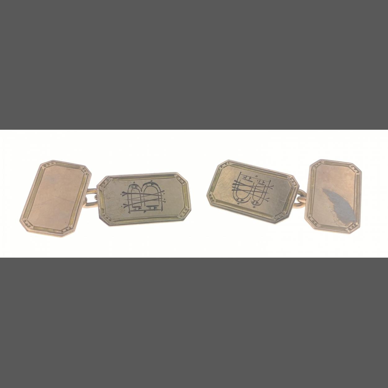 An unusual pair of SCOTTISH marked 9ct Gold cufflinks with J LYL Ayr stamps. Each with a WB (or BW) initial. Very unusual marks undated but likely pre war. Total gross weight 4.9g approx.