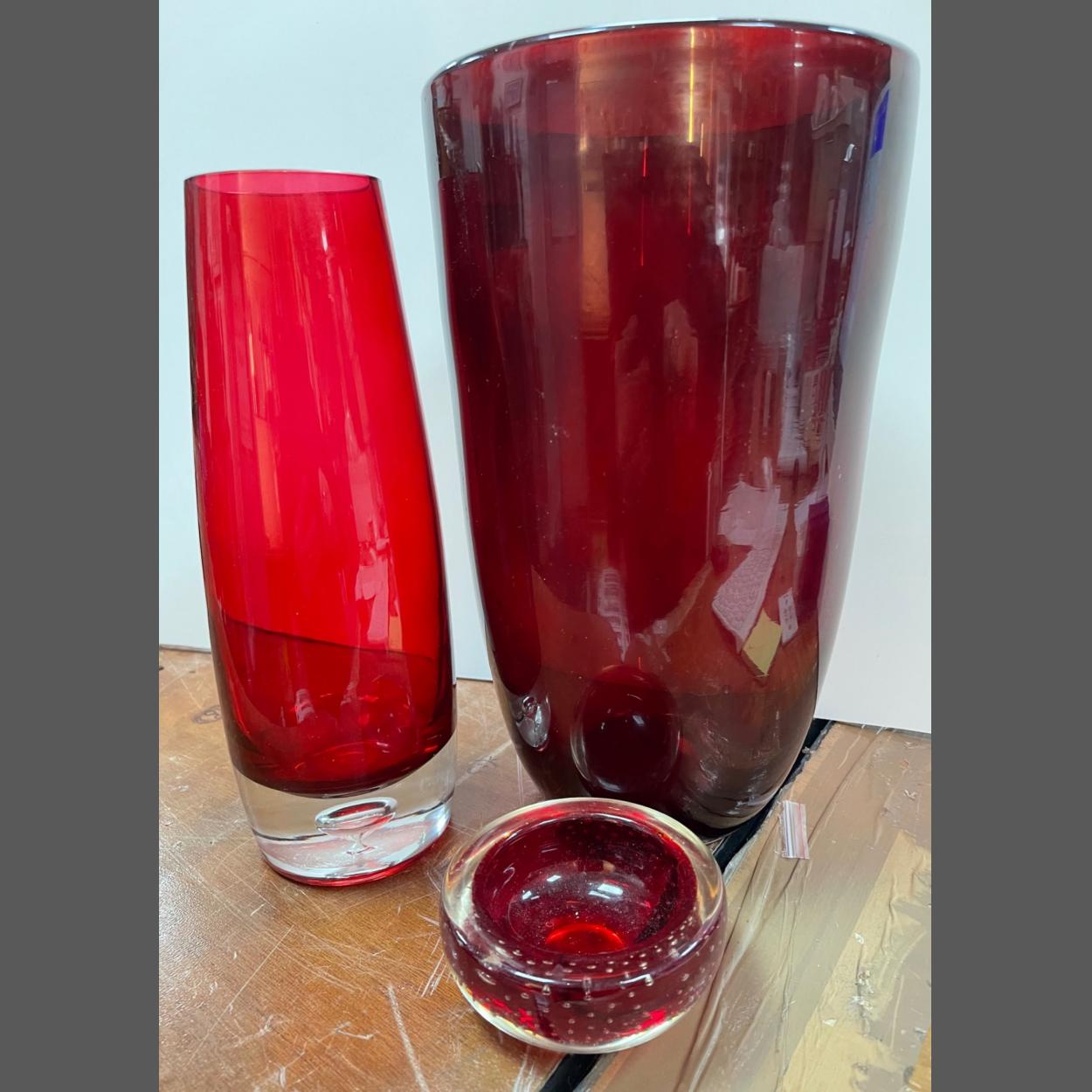 CRANBERRY GLASS inspired lot! Three pieces of glass to include a very large red glass vase dimensions 31cm height x 18cm approx
