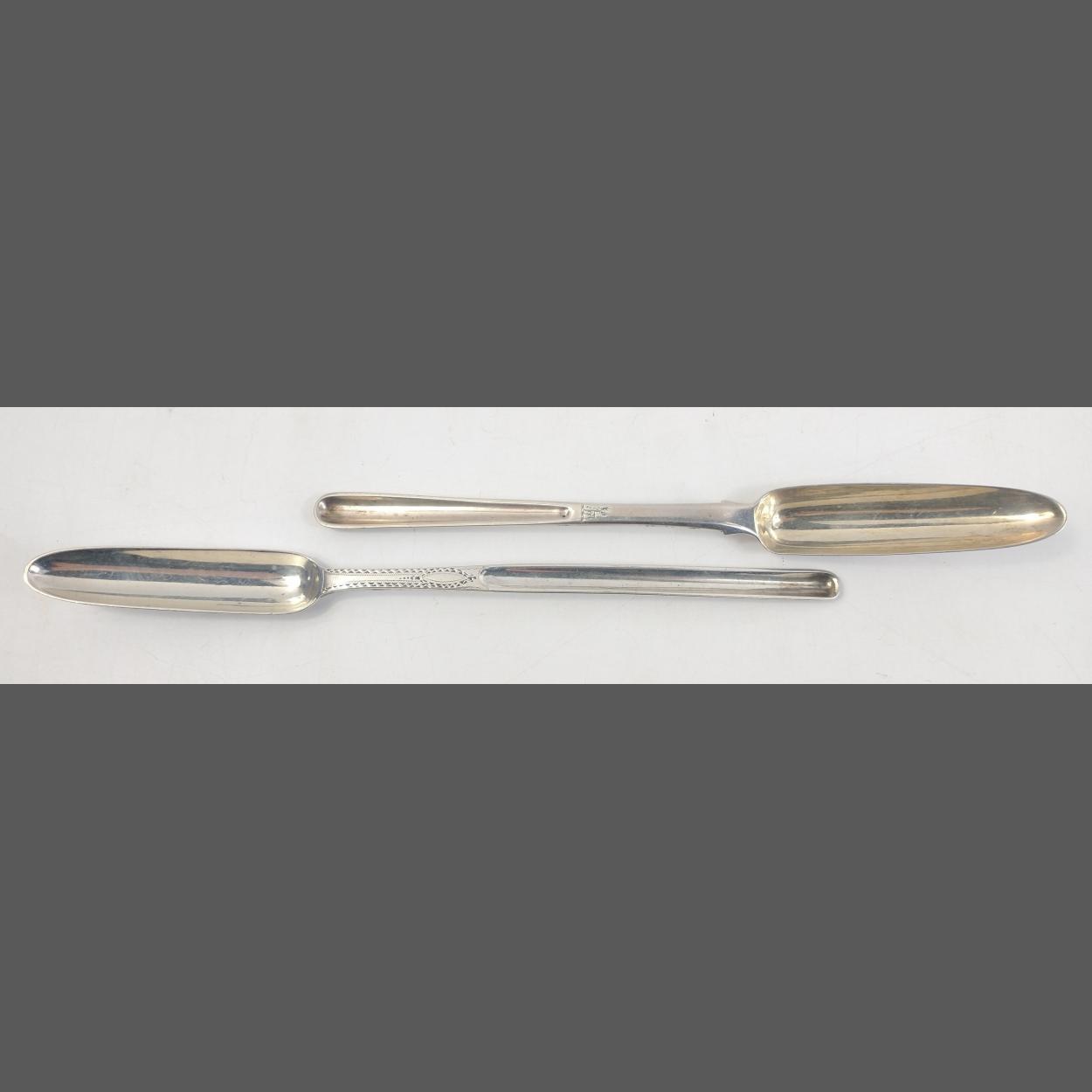 Two London hallmarked marrow spoons, one 1819 (21cm long), the other too well-rubbed to read (23cm long) weight 82g approx