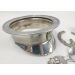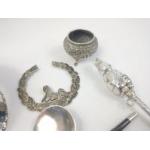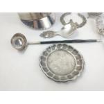 A mixed bag of white metal items to include a Norge caddy spoon, a decorated pot, a small Chinese tray, a rabbit shaped rattle (minus rattle), a small ladle etc