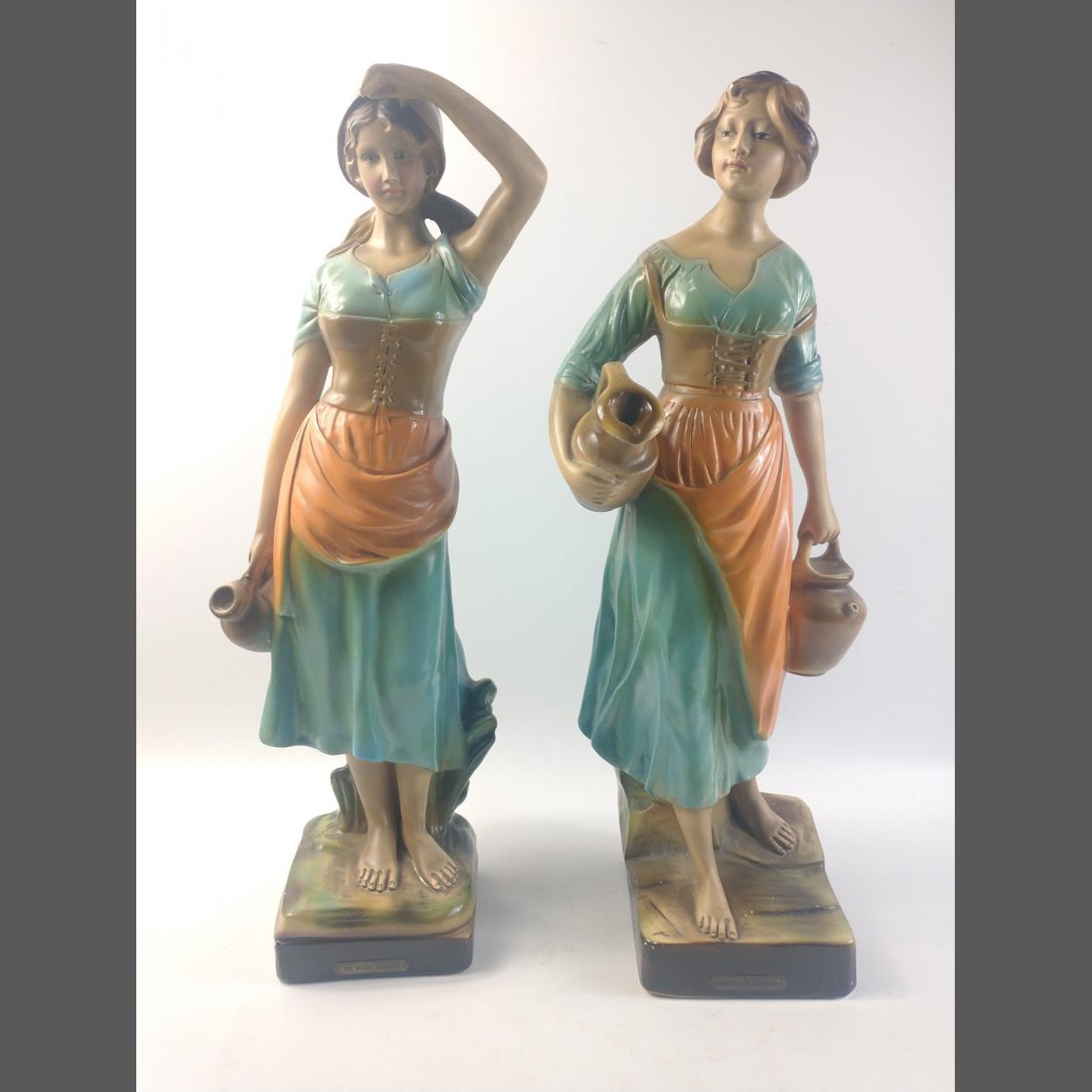Two ANTIQUE FRENCH THE WATER DRAWERS ceramic figurines carrying water pitchers handpainted in blue and orange dress - 25" tall each and in good overall condition!
