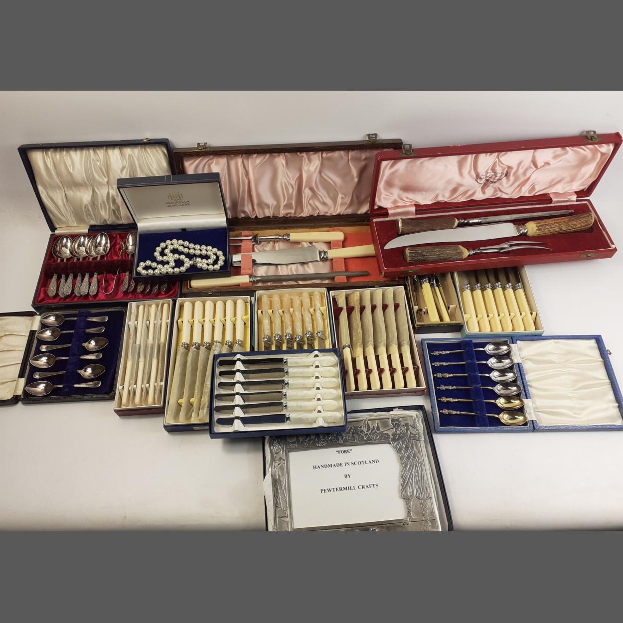 A collection of 12 sets boxed cutlery to include a three piece horn-handled carving set and a string of faux pearls