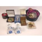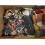 A box of costume jewellery and other treasures to include an attractive brooch by MARALYN REED-WOOD (8cm dia), Royal Doulton WINE BOTTLE STOPPER in the style of RENNIE MACKINTOSH, a boxed PAPERMATE pen, a stained glass hand-painted box 6x6x4.5cm