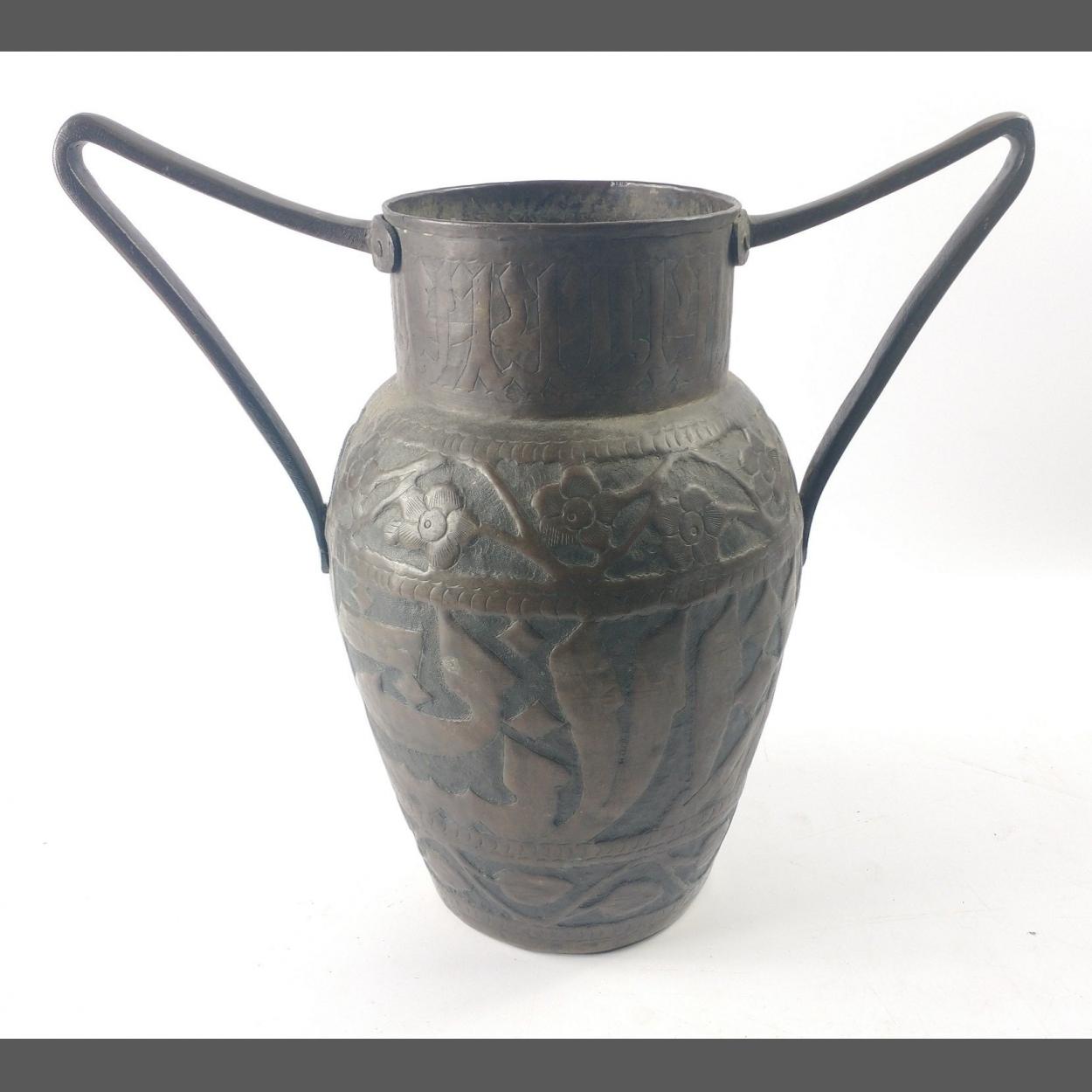 A Middle Eastern copper hammered twin-handled vase with Arabic script and a leaf and floral border, stands approx 31cm tall
