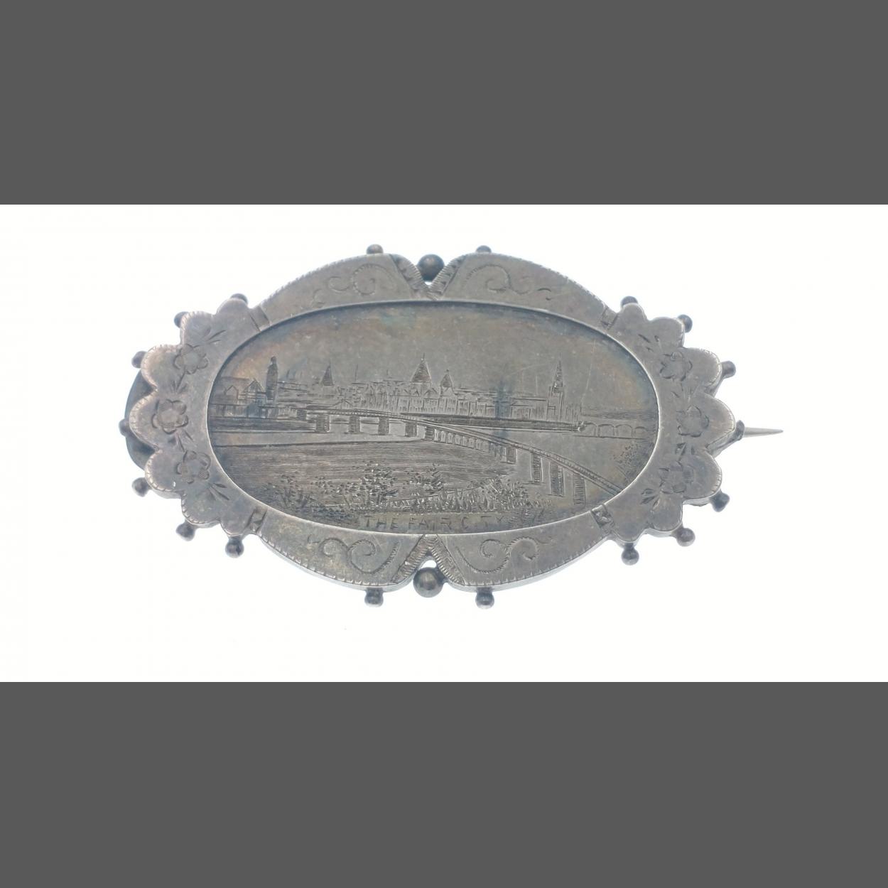 A stunning little solid silver brooch by William Twigg and carrying full hallmarks from Birmingham 1889. A finely inscribed representation of a city skyline with THE FAIR CITY underneath. Scene depicts the second TAY BRIDGE looking towards DUNDEE. A super little memento of Scottish Victorian history.