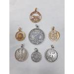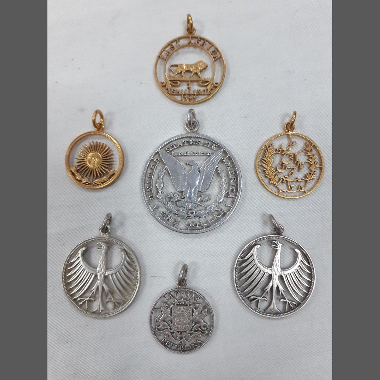 Numismatists hide your eyes! A lovely small collection of cut coin pendants. Seven original coins which have been carefully cut out and mounted as pendants. Includes a USA Morgan Dollar, a 1949 South African Shilling, an 1891 Tunisian 5 Centimes, a Latvian 1924 Lat, Two German States coins and one other. Nice jewellery items. The cut Morgans are currently offered by Vermont Cut Coins in the US at over $200 each
