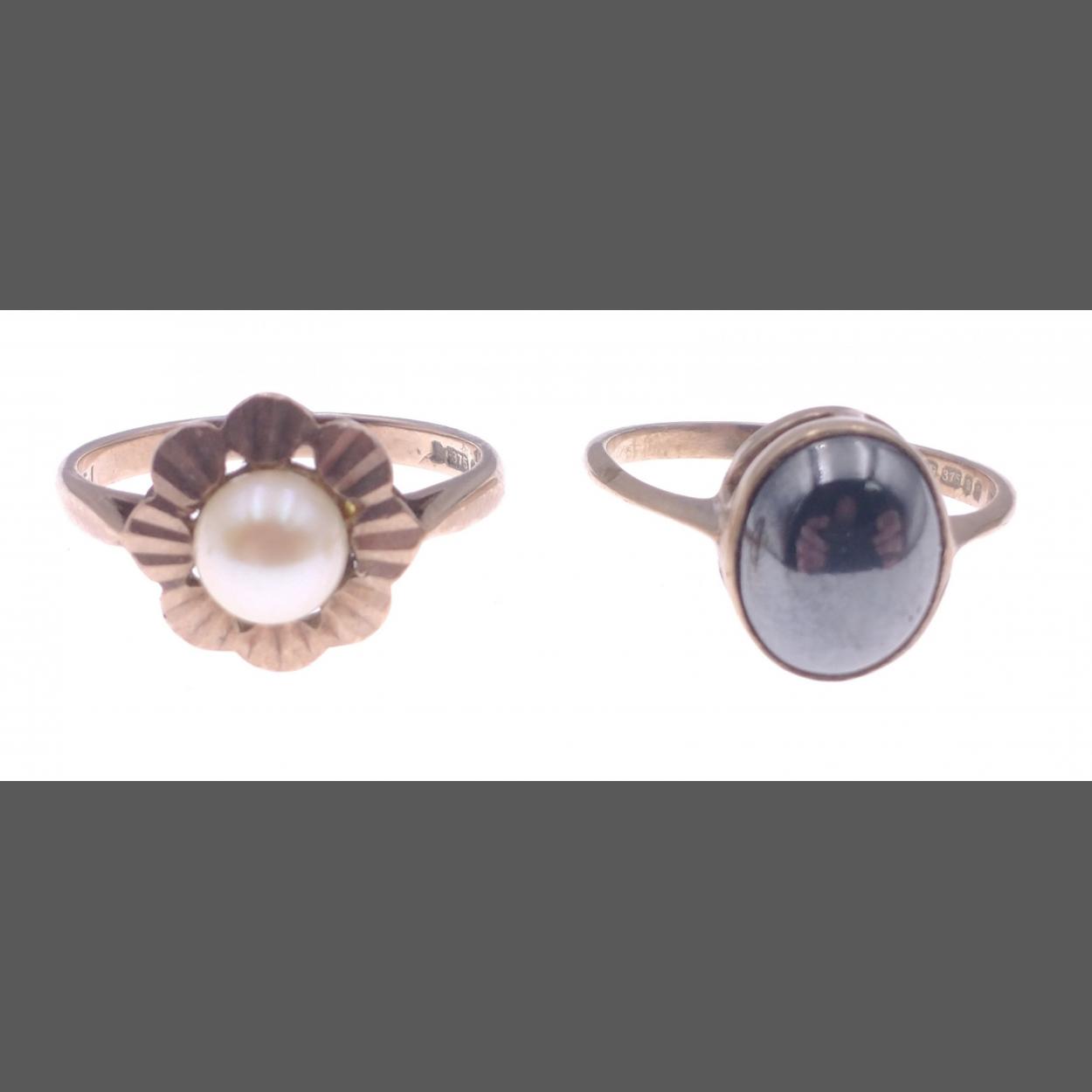 TWO VINTAGE 375 stamped yellow gold dress rings to include a nice floral form with pearl inset ring size N/O gross weight 2.72g approx with also a 375 stamped ring with a mounted nice polished oval black stone - gross weight 2.29g - ring size M