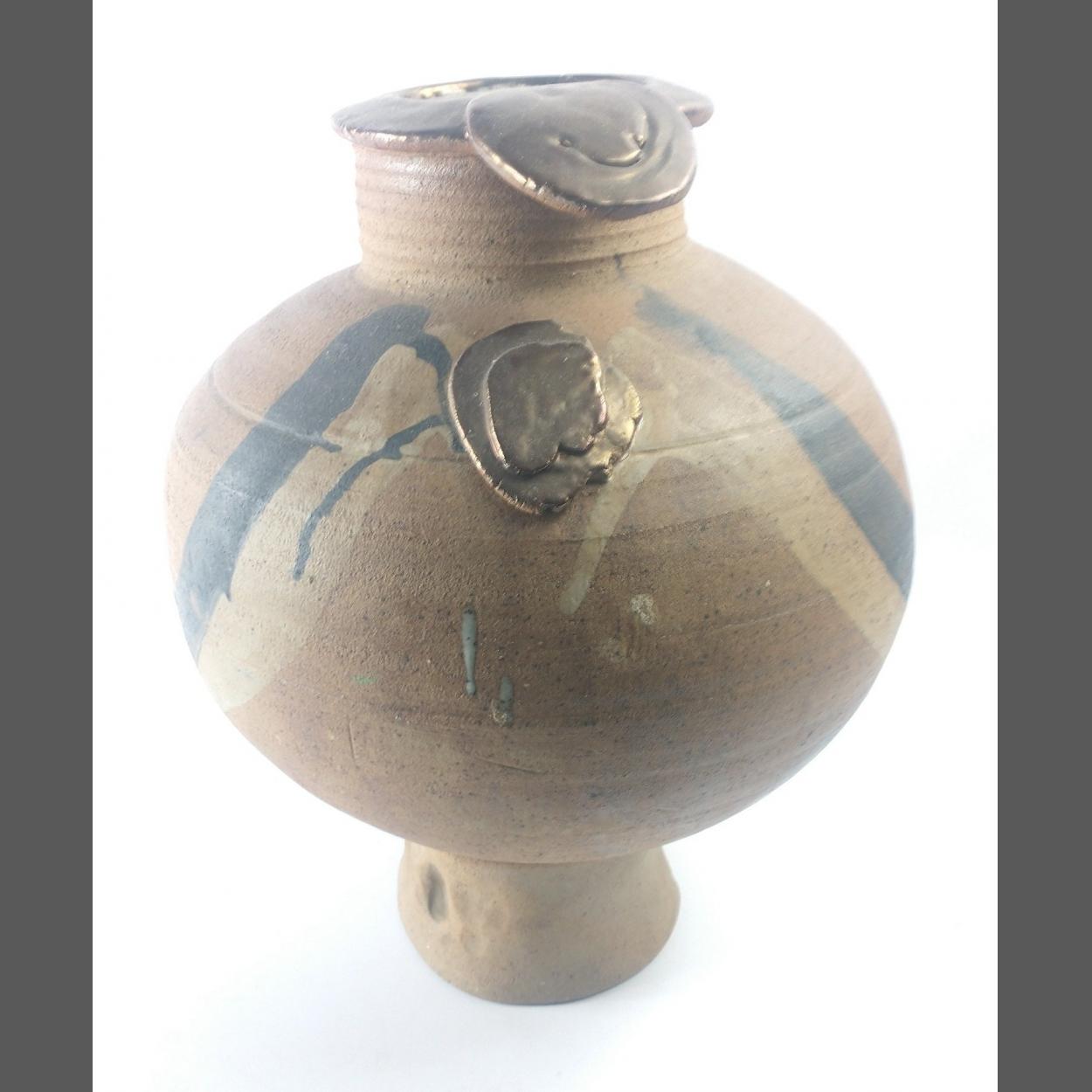 Unusual footed lidded stoneware pot with copperised style lid and Victorian scene. 38cm approx tall, 33cm approx wide