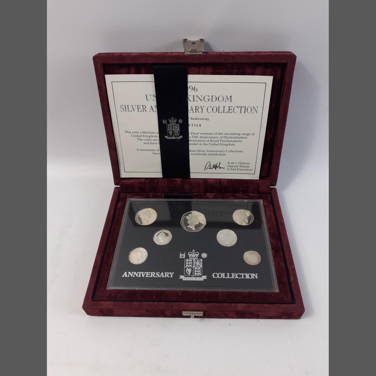 ROYAL MINT 1996 United Kingdom Silver Anniversary collection with COA numbered 03368. Attractive plush case and coins in Perspex slab. Outer plush has some wear, contents are perfect.