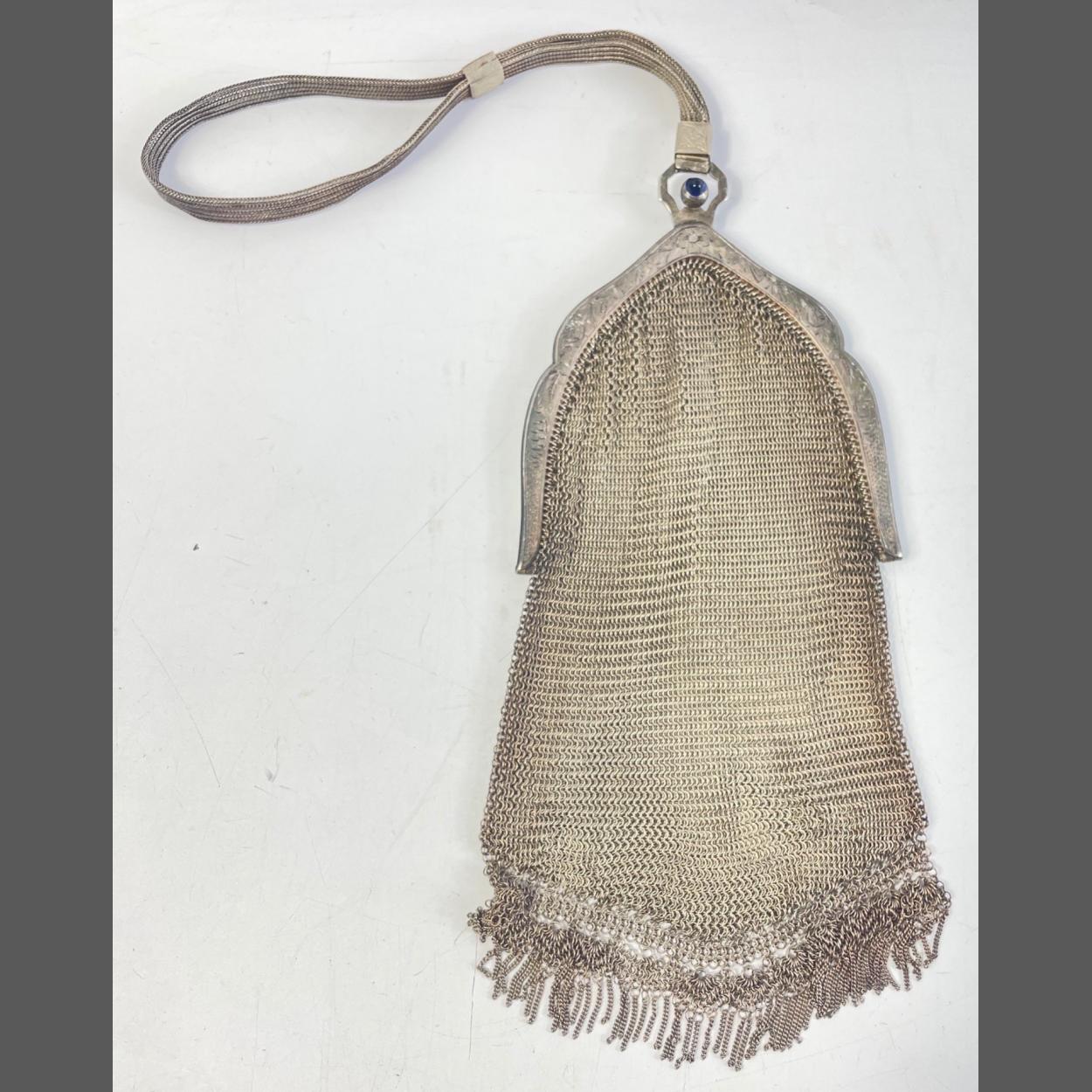 VERY GRAND! A ladies white metal mesh evening purse set with a blue stone 7cm wide approx and 17cm long plus strap