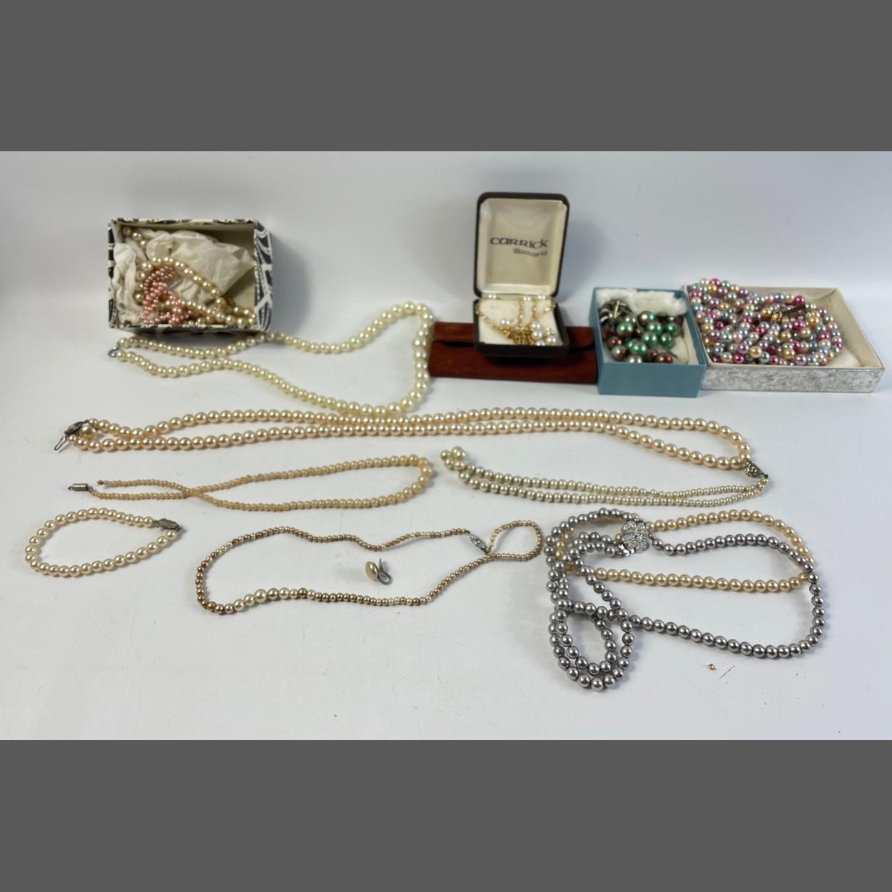 A collection of faux pearl necklaces included a three string necklace of multi-coloured cultured pearls