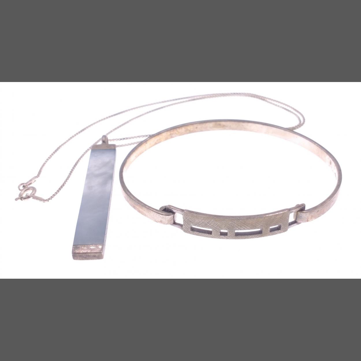 A sterling SILVER 925 marked bangle and a pretty Mother of Pearl pendant on a 925 chain. Total gross weight 20g approx