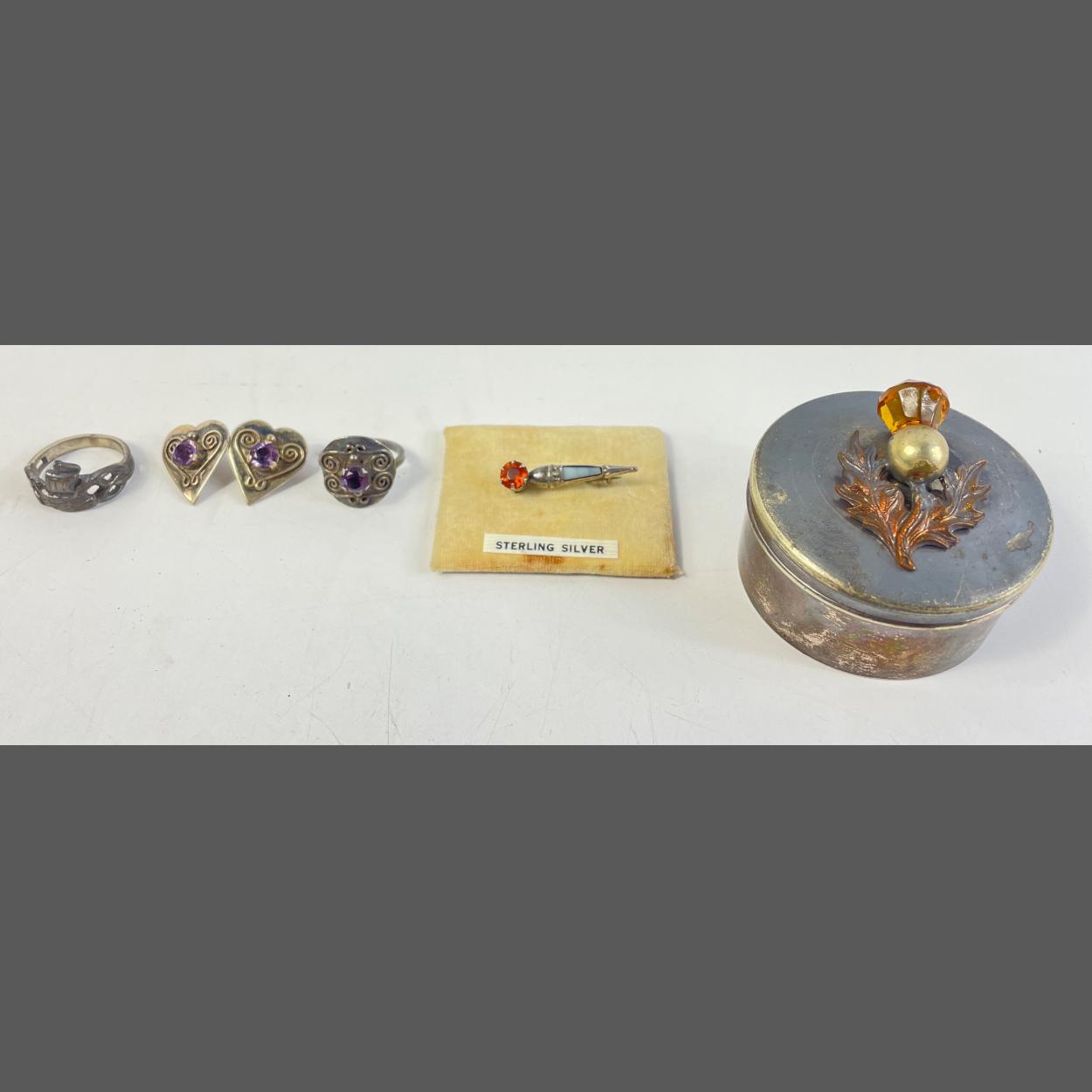 VINTAGE! A small EPNS box with a thistle on the lid with an amber coloured stone 5cm dia, with a ring stamped silver with a Viking longship design, size R, weight 5.4g, plus a ring (size L) and pair of clip-on earrings with purple stones, gross weight 10.9