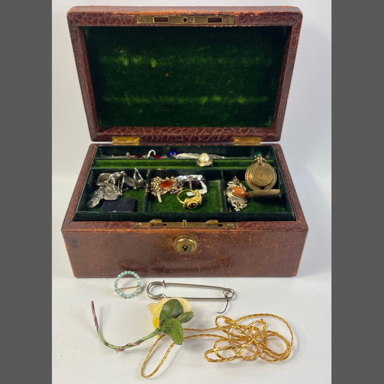 A worn (FABULOUS PATINA!) vintage leather jewellery box with a green velvet lined interior plus contents to include a gilt sovereign case 23x15x10cm approx