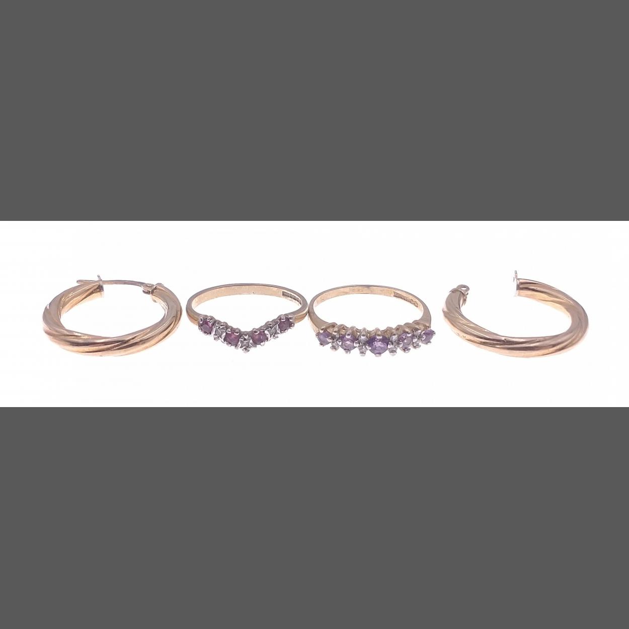 Two small pretty 9ct gold rings with full hallmarks including 'DIA' stamps. One size K and one size L. Also a pair of 9ct gold hoop earrings one with broken catch. The total gross weight 4.1g approx