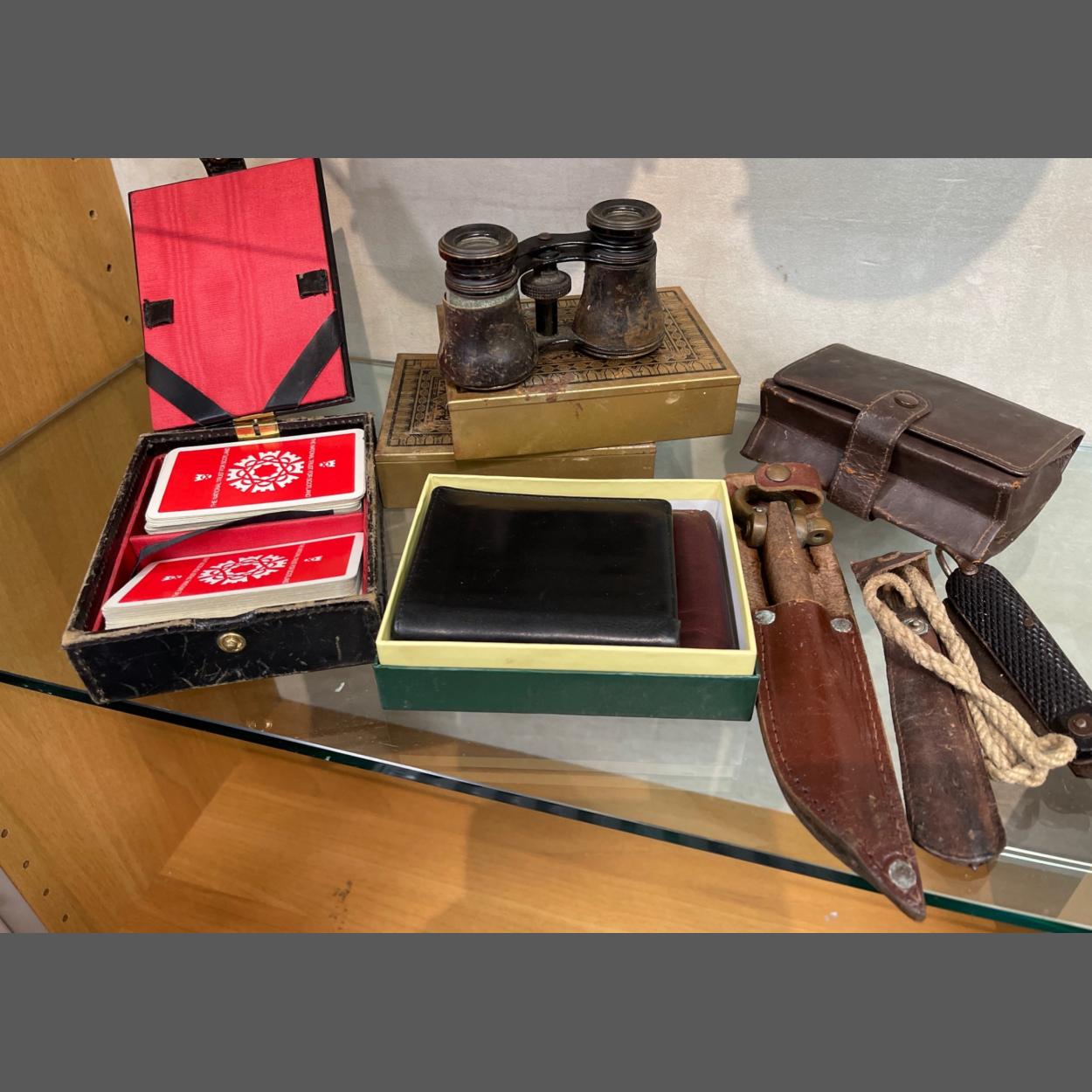 A box of antique curios to include an old pair of operatic binoculars, two vintage plumb-lines with their original leather sheaths, two interesting tin boxes, a pen knife and a couple of leather wallets etc