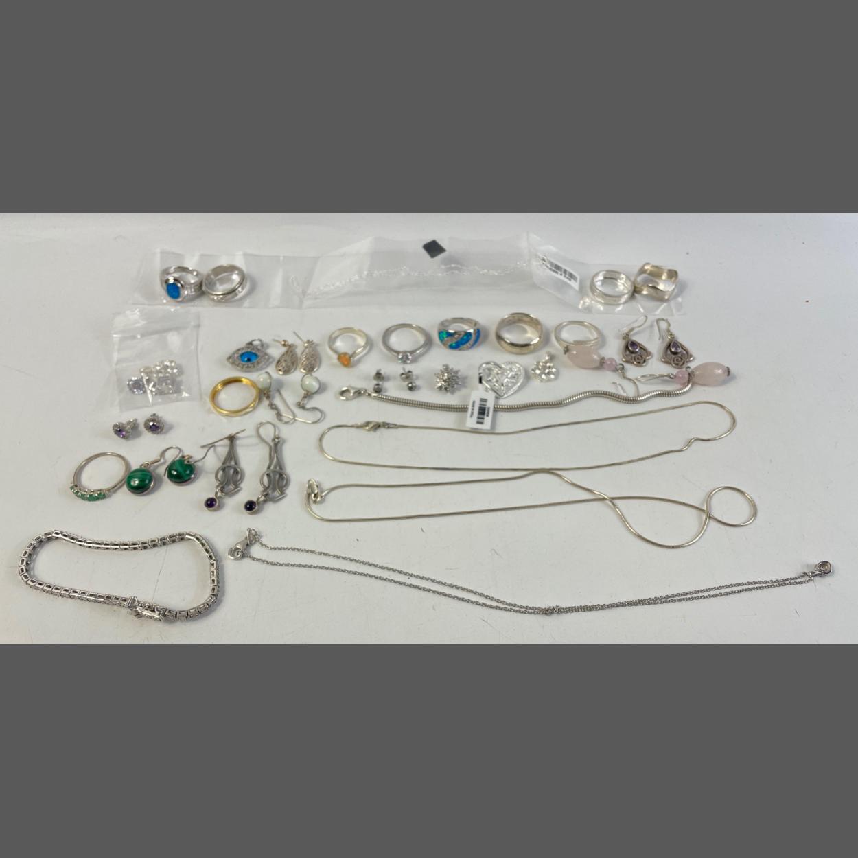 A mixed collection of stamped 925 silver jewellery from TJC to include a tennis bracelet, multiple rings of varying sizes P-U, a heart-shaped pendant, multiple pairs of hook earrings, total gross weight 112g approx