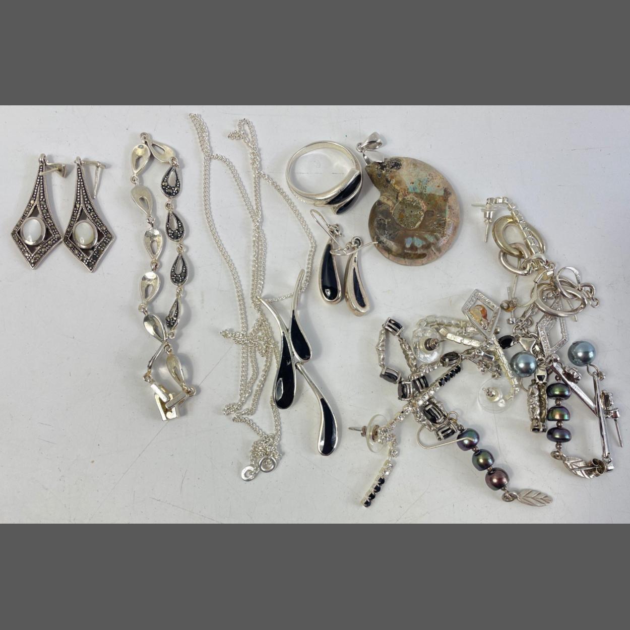 A mixed collection of jewellery to include a set of necklace, earrings and ring Size U (gross weight 19.35g approx), a pair of marcasite drop earrings and bracelet (gross weight 12.00g), to include a mixture of drop earrings plus bracelets and an ammonite pendant (approx 4cm long) etc